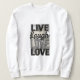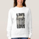 Dieses T - Shirt-Design zeichnet sich durch das klassische Mantra "Live / Laugh / Liebe" vertikal aus und erzeugt einen visuell interessanten, rasterähnlichen Effekt. Die einfache und dennoch leistungsstarke Botschaft, kombiniert mit dem einzigartigen Layout, macht dieses Design sowohl stilvoll als auch inspirierend.