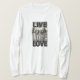 Dieses T - Shirt-Design zeichnet sich durch das klassische Mantra "Live / Laugh / Liebe" vertikal aus und erzeugt einen visuell interessanten, rasterähnlichen Effekt. Die einfache und dennoch leistungsstarke Botschaft, kombiniert mit dem einzigartigen Layout, macht dieses Design sowohl stilvoll als auch inspirierend.