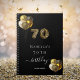 Pour une soirée élégante de 70ème anniversaire. Un arrière - plan noir, décoré de ballons. Le numéro 70 est écrit avec une police de style ballon tendance, motif léopard. Personnalisez et ajoutez un nom et une date. Le mot anniversaire est écrit avec un script de style moderne écrit à la main avec des swashes.