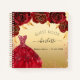 Pour une Quinceañera, fête du 15e anniversaire. Un arrière - plan en faux or avec de la poussière de parties scintillant, une robe et des roses rouges, des fleurs. Le nom est écrit avec un script de style moderne écrit à la main. Personnalisez et ajoutez un nom et une date.