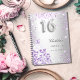 Un arrière - plan métallique à l'aspect faux argenté décoré de poussière de parties scintillant violet et violet et d'une robe. Personnalisez et ajoutez un nom et une date. Le numéro 16 est écrit avec un script de style ballon.