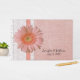 Livre d'hôtes rustique chic mariage réalisé dans un look burlap couleur pêche. Des graphismes de dentelle blanche, un ruban couleur pêche satiné et une grande fleur marguerite de pêche Gerber, décorent l'avant gauche du livre. Personnalisez les champs de texte pour votre journée spéciale.