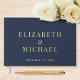 Elégant livre d'or bleu marine mariage avec vos noms dans la grande typographie serif classique, monogrammé dans votre choix d'or réel, d'argent ou d'or rose, votre date de mariage et votre titre personnalisé sur la colonne vertébrale.