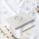 Livre d'or sur mesure, mariage de couleur beige et argentée, avec un monogramme moderne et élégant en feuille de feuillage, avec initiales, nom et date de mariage personnalisés.