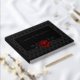 The Design features grey and black damask and a red, bloody rose. The font is in real silver foil that contrasts with the dark background. At the bottom there is a bleeding red rose giving a mysterious and slightly dark touch. The rose symbolizes love and passion while the blood represents the depth of emotions. Overall, the guest book exudes a certain drama and intensity that immediately attracts the attention of the recipient. It's perfect for couples looking for an unconventional and unique wedding.