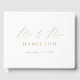 Elégant livre d'or de mariage avec "Mr et Mrs" exposé dans un script de calligraphie or moderne sur un arrière - plan blanc. Personnalisez l'avant du simple livre d'hôtes mariage avec votre nom de famille et votre date de mariage. L'arrière du livre d'or affiche votre photo fiançailles horizontale. Ajoutez votre nom de famille et votre date de mariage à la colonne vertébrale du livre d'or.