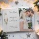 Ce joli livre d'or botanique d'hiver présente des bouquets de roses et de fleurs d'ivoire, des baies rouges, des flocons de neige en sapin et en or entourant un élégant étiquette d'or pour votre monogramme sur un arrière - plan gris perle pâle. Inclut les champs de texte modifiables et le modèle photo.