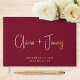 Ce livre d'hôtes mariage rouge bordeaux minimaliste et élégant vous propose votre choix d'or véritable, d'argent ou d'or rose, vos noms dans un script moderne chic, votre date et votre emplacement mariage dans la typographie serif classique et votre titre personnalisé sur la colonne vertébrale.