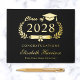 Élégant livre d'invité de la fête de graduation noire avec une véritable feuille d'or, "Classe de" dans une illustration de couronne de laurier incorporant un casquette et un diplôme, le nom du diplômé dans un script formel, et "Félicitations" et leur nom d'école dans la typographie serif classique. Personnalisez le texte supplémentaire sur la colonne vertébrale et le dos.