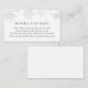 Une carte d'insertion de demande de livre pour le baby shower. Avec des flocons d'argent et du poème : "UNE PETITE DEMANDE, NOUS ESPÉRONS NE PAS TROP DIFFICILE D'APPORTER UN LIVRE PLUTÔT QU'UNE CARTE QU'ILS CHERCHERCHERONT LE LIVRE, BIEN AIMÉ OU NEUF S'IL VOUS PLAÎT SIGNER L'INTÉRIEUR AVEC UN MESSAGE DE DE VOUS!"