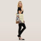 Knitting tote bag with llama image. The llama is rusty tan and white and chews on some grass. "Let's Knit" text is a template over a light yellow checkered background that wraps around to the other side. This bag is lined and would be perfect for hauling a knitting project.