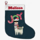 Weihnachts-Strumpf personalisiert mit einem Namen. Eine skurrile Abbildung. Ein niedliches Lamm mit schwarzer Sonnenbrille, eine rote Weihnachtsmannmütze und ein festlicher Winterschal. Auch tragen eine südamerikanische Decke und Pom-Poms. Das Wort Joy schrieb über seinem Kopf in einem festlichen bunten Schriftart. Set auf dunkelblauem Hintergrund.