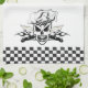 Dieses coole Kochstuch nach Maß ist gerade, was ein Koch an Hand zu jedem Abwischen benötigt, das hartes Funktionsgesicht oder das schmutzige Geschirr (nicht beide), beim einen Mörder Cuisine oben kochen! Fügen Sie Ihren Namen diesem coolen kundengerechten Kochsschädelprodukt hinzu und einen unheimlichen Kochsschädel kennzeichnen, der seinen Kochshut, mit zwei Scharfes gekreuzten Transchiermessern des Koch, vor einer mutigen schwarzen Flamme trägt. Karierte Schwarzweiss-Platten zeichnen jedes Ende. Der Hintergrund kann zu einer Farbe Ihrer Wahl geändert werden. Dieses Produkt ist ein großes Geschenk für den Führungskraft-Koch, sous Koch, Linie Koch, Zuhausekoch oder irgendwie kulinarisches berufliches mit einer heftigen Leidenschaft für das Kochen. Besuchen Sie www.zazzle.com/thechefshoppe und www.zazzle.com/whiskybusiness, um die cooleren kulinarischen themed Schädel zu sehen, die durch sdesiata, auf Tonnen Produkten entworfen sind, die durch Zazzle angeboten werden.
