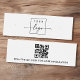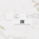 Carte d'affichage de mini produit avec modèle de logo personnalisé centré et code QR sur le dos. Les repères d'oreille peuvent être ajustés en ajoutant et en enlevant des espaces dans le champ modèle, et en déplaçant l'élément entier dans l'outil de conception.