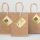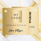 Imitate mit goldenem Hintergrund. Schwarzer Text. Personalisieren Sie Ihr Firmenlogo, Text und Name/Unterschrift und fügen Sie es hinzu. Zurück: QR-Code auf Ihrer Website oder sozialen Medien, Text.
