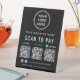 Einfaches modernes schwarzes Tischschild für Ihr Geschäft mit Venmo-, Paypal- und CashApp QR-Codes für Kunden zum Scannen von Zahlungen. Fügen Sie Ihr Logo, QR-Codes und Firmennamen, Telefonnummer und Website in einfacher weißer Schrift hinzu. Fügen Sie Ihre instagram und facebook Benutzer-ID für Kunden, um Ihnen auf Social Media folgen.