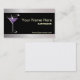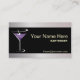 Carte de visite tenant le bar de barman pourpre de Martini avec le logo en verre de Martini. Arrière - plan métallique pourpre pâle. Cartes de visite chics simples pour les professionnels tenants le bar. Customisez votre police et colorez tous en ligne.