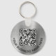 Promotioneller Schlüsselanhänger für Ihr Unternehmen oder Ihre Organisation mit einem silberfarbenen Imitat aus gebürstetem Metall. Fügen Sie Ihr Logo, QR-Code und zwei Zeilen Text, wie Ihr Firmenname, Slogan, danke, oder verlass leer.