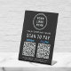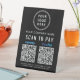 Modernes schwarzes Tischschild für Ihr Geschäft mit Venmo und Paypal QR Codes für Kunden zu scannen nach Zahlungen. Geben Sie Ihre URL Website Links zu Venmo und Paypal, um QR-Codes für Kunden zu scannen nach Zahlungen zu erstellen. Fügen Sie Ihr Logo und Ihren Firmennamen, Ihre Telefonnummer und Ihre Straßenanschrift in einfacher weißer Schrift hinzu.