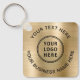 Einfaches Schlüsselanhänger für Ihr Unternehmen oder Ihre Organisation auf einem goldfarbenen Imitat mit metallischem Hintergrund. Fügen Sie Ihr Logo oder QR-Code und zwei Zeilen individueller Text, wie z. B. Ihr Firmenname, Slogan, danke, oder verlass leer.