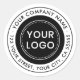 Weiß oder jedes farbige Rücksendetikett mit dem eigenen Logo, dem Bild oder dem Foto auf einem schwarzen (oder farbigen) Kreis in der Mitte und Ihrem Firmennamen und Ihrer Rücksendeadresse in einem modernen serifenlosen Schriftart.