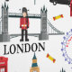 London, England Muster mit englischen Elementen wie Telefonkabine, Doppeldecker Bus, London Bridge, London Ferris Wheel und mehr. Composite Design von Holiday Hearts Designs (Rechte vorbehalten).