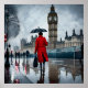 Die zeitlose Architektur des Big Ben und des Houses of Parliament ist Set vor einem regnerischen Londoner Hintergrund. Eine Figur in einem kühlen roten Mantel sticht hervor, ihr Schirm ist ein Symbol der Widerstandsfähigkeit gegen die Elemente.