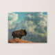 Ein einsamer Bison steht auf einem grasbewachsenen Hügel in den Ebenen des amerikanischen Westens und blickt über die sanften Hügel. Gedrohte Wolken füllen den Himmel, und die kommenden Stürme verkünden ihren Ansatz, indem sie Blitzschmieden zum Boden schicken und in der heißen Nachmittagsluft über das Gras stürzen.