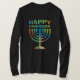 Célébrez Hanoukka avec cette chemise gainée long de vacances colorées pour des dames qui indique, "Hanoukka heureux" au-dessus d'un menorah.