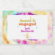 Dieser Mini-Schaumwein-Aufkleber bietet eine helle gefärbte Krawatte Hintergrund und lustigen Groovy 70er-Thema Schriftart mit dem Sprichwort, "getönt und verlobt". Dieses Label enthält lustige Verlobung Ring-Friedenszeichen und Sterne. Diese Einladung eignet sich perfekt für Ihr 70er Hippie-Junggeselinnen-Abschied oder Brautwochenende.