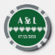Offrez aux invités, aux demoiselles d'honneur, aux groomsmen, ou à toute autre personne qui assistera ou aidera avec votre mariage geek ou événement spécial un plaisir amusant avec ces jetons de poker personnalisables. Un côté de la puce de poker présente un coeur pixélisé blanc sur un riche arrière - plan vert émeraude. L'autre côté dispose d'un ensemble d'exemples d'initiales et de date séparées par un motif de jeu vidéo rétro lié aux coeurs 8 bits. L'exemple de texte peut être customisé avec vos propres détails ou un message spécial de votre choix pour créer un jeton unique et personnel pour commémorer votre grand jour. Ce design correspond à n'importe quel produit de la gamme Our 8-Bit Hearts in Green afin que vous puissiez rendre votre jeu de thème mariage ou événement spécial aussi coordonné que vous le souhaitez.