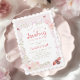 A soft and elegant baby shower invitation featuring blush pink florals, delicate greenery, charming ladybugs, and a graceful bow. The gentle pastel color palette and romantic garden style make this design perfect for a baby girl shower. Matching items available.