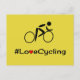 N'aimez pas seulement le vélo : #LoveCycling ! Une carte postale pour tous ceux qui aiment faire du vélo. Texte simple en noir avec un coeur rouge, et un cycliste pictogramme ci-dessus, sur un arrière - plan jaune couleur jersey.