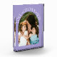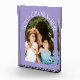 Modern and minimal family memory photo block featuring a photo in a arch frame with a text that says "Love Grows Here" with tiny hearts. Lilac.