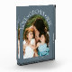 Modern and minimal family memory photo block featuring a photo in a arch frame with a text that says "Love Grows Here" with tiny hearts. Slate blue.