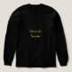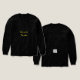 A woman stands against a soft neutral backdrop wearing a fitted black long-sleeve shirt, that turns minimalism into a quiet statement. In delicate yellow script across her chest the words read: "Love is cute. I’m cuter." The contrast is striking. Midnight fabric golden lettering. The phrase feels fluid, almost alchemical, as if the wearer is the element that gives emotion its shape. She pairs the shirt with light gray jeans, casual and effortless, hands relaxed, posture open. The overall look is clean, modern and gently expressive. A simple outfit that whispers philosophy rather than shouting fashion.