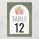 Tropical dried palm leaves, pampas grass and protea flowers green arch wedding table number. This pretty wedding design features an arch frame on green stained background. In the frame there is a bouquet of dried palm leaves, protea flowers and pampas grass.