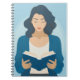 Eine Frau mit dunklem Haar, die einen blauen Kardigan über einem weißen Shirt trägt und in einem Buch vertieft ist. Das Design ist minimalistisch, mit einem Schwerpunkt auf glatten Linien und soliden Farben, die dem Bild eine ruhige und ruhige Atmosphäre geben. Der Hintergrund ist hellblau und kontrastiert sanft mit dem tiefblauen Kardigan und dem Buchcover. Die Augen der Frau sind geschlossen, was auf eine tiefe Konzentration oder Introspektion beim Lesen hindeutet. Der Stil ist modern und sauber, wobei der Schwerpunkt auf Einfachheit und Ruhe liegt.