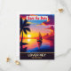 Lover Key Save the Date Hochzeitseinladung, Reise Postkarte. Segelboot auf dem Wasser in der Nähe der Küste, Palmen, schöner Sonnenuntergang im Sommer in lebhaften Farben.