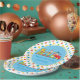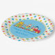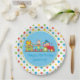 Diese Partyplatte kennzeichnet einen blauen Hintergrund, der durch einen wiederholenden Rüttler der roten, blauen, gelben und grünen Sterne umgeben wird. Ein Zirkuszug mit drei Autos mit einem Clown, der den roten Motor fahren, einem blauen Auto mit einem jonglierenden Affen und einem grünen Auto mit einem niedlichen Löwe sitzt mitten in der Platte.