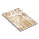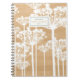 Spaß und retro personalisiertes Notizbuch, die weißes Löwenzahnmuster auf hölzernem Hintergrund kennzeichnen.
