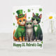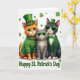 This card shows three dressed-up cats gathered close for St. Patrick’s Day, their shoulders nearly touching as if they’re posing for a friendly photo 💚. In the middle, an orange tabby with big green eyes wears a textured green knit sweater with a small orange heart on the chest and a little leprechaun hat tilted forward. To one side, a grey tabby leans in with green-framed sunglasses and a tiny green hat, giving the group a cool, companionable look. On the other side, a black-and-white cat stands neatly in a green suit jacket with gold buttons, a pleated white shirt, a green bow tie, and matching green-rimmed shades, topped with a miniature hat. The background is bright white, lightly scattered with green shamrocks and four-leaf clovers ☘️, so the green outfits stand out. “Happy St. Patrick’s Day” appears neatly on the front in green lettering, set to frame the trio without covering them. Small clover shapes dot the open space around their hats and shoulders, like confetti drifting across the white backdrop.
