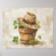 Dieses Kunstwerk ist ein charmantes und rustikales Stillleben mit einem verwitterten Terrakottapult mit lebhaften, grünen Vierblättrigen, die aussprießen und viel Glück und Vermögen symbolisieren. Ein abgetragener Strohhut, der möglicherweise einem Bauer oder Gärtner gehört, wird gelegentlich auf dem Topf platziert und verleiht der Szene eine Touch von Charakter und Erzählung. Der Hintergrund ist strukturiert und erdig, mit warmen, neutralen Tönen, die das natürliche und Bio Gefühl der Komposition verstärken. Dieses Gemälde strahlt ein Gefühl von Einfachheit, Wärme und eine Verbindung zur Erde aus und macht es zu einem perfekten Stück für diejenigen, die die Schönheit von einfachen, alltäglichen Objekten schätzen.