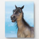 3D digitale Darstellung eines niedlich lächelnden Grullienpferdes mit blauen Augen auf blauem Himmelshintergrund. Perfektes Geschenk für alle, die Spaß und Lachen Lieben haben