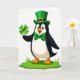 On the front of the card, a cartoon-style penguin stands centered on a small patch of green grass against a white background, dressed for St. Patrick’s Day with an emerald top hat and a gold buckle. A matching green bow tie sits under its beak, and its black-and-white feathers are accented by an orange beak and feet. The penguin’s wide smile, bright eyes, and rosy cheeks give it a friendly, slightly flirty look, like it’s sharing a lucky find with someone special 💚. One wing lifts a four-leaf clover up and forward, as if offering it to a close friend or sweetheart ☘️. Across the clover, the word “Luck!” appears in dark lettering, centered on the leaves and easy to spot. The hat has a shiny highlight and soft shading, while the clover’s leaves are shaped like small hearts. The scene stays simple and focused, with the penguin upright in the middle and the green grass forming a small base beneath its feet.