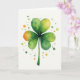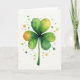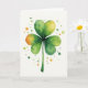 This design shows a single three-leaf clover painted in watercolor, centered on a softly textured off-white background, with a calm, intimate focus that feels like a quiet gift between close friends 💚. The rounded leaves open gently, and the slim stem drops downward as if offering the clover to someone just out of frame. Deep emerald tones fade into lighter green and chartreuse, with small touches of warm ochre and soft tangerine brushing the tips. Around the clover, scattered dots in greens and oranges float like drifting dew, adding a light, celebratory motion ☘️. There’s no lettering on the front, so the open space around the clover reads like a pause where you might imagine a note being added inside. The paint edges feather and bleed in places, giving the clover a tender, lived-in look rather than sharp outlines. The off-white backdrop stays lightly speckled, while the green-and-orange dots taper outward across the page.