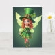 This card features a leprechaun-fairy sprite centered on a deep emerald background, bringing a friendly St. Patrick’s Day mood to the scene 💚. She stands in a light step with arms gently open, like she’s greeting a close friend with an easy, affectionate welcome. A tall green top hat with a gold buckle and two shamrocks sits above curled auburn hair that spills down in soft ringlets. Her bright blue eyes and rosy cheeks pair with a small, knowing smile that feels like a shared secret ☘️. She wears a strapless green dress with gold lacing and trim, flowing into a ruffled skirt that adds movement around her knees. Mid-calf green boots detailed with gold scrollwork and slim sleeves finish the outfit, while translucent lime-green wings spread behind her with a faint glow. The greeting text sits near the top in light gold lettering against the dark green field, and the wings fade outward in pale lime tones behind her shoulders.