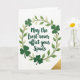 This greeting card features a friendly blessing, “May the frost never afflict your Spuds,” written large in dark emerald green across the center on a white background 💚. The lettering curves smoothly, giving the line a warm, teasing tone that feels like something shared between close friends. Around the words sits a circular wreath of twisting vines and small leaves, layered in many greens from deep forest to light spring tones. Tucked into the wreath are four shamrocks in a solid, darker green, evenly spaced like little lucky accents ☘️. The text stays centered while the greenery frames it closely, as if leaning in to spotlight the message. The open white space keeps the design airy, making the greens stand out without crowding the page. In the bottom-right corner, a narrow sliver of golden ribbon peeks in at an angle, adding a small warm highlight against the white.