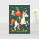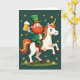 This card shows a cheerful leprechaun riding a white unicorn across a rich green field, setting a friendly, romantic-in-a-fun-way scene for St. Patrick’s Day 💚. The leprechaun wears a tall emerald hat with a gold buckle and a matching green suit, and his ginger beard frames a wide grin aimed fondly toward his magical companion. One hand lifts a foamy mug of golden ale as if to toast someone close by, while the other steadies him in the saddle. The unicorn’s blue eyes look gentle and attentive, with a spiraled golden horn catching the light above its forehead. A flowing rainbow mane and tail stream behind them like a shared parade ribbon, adding 🌈 color to the deep green background. Near the top, the greeting text sits in a light yellow tone against the darker forest-green sky, easy to spot without overpowering the artwork. Below them, small yellow four-petaled flowers dot the grass while tiny sparkles scatter around their path, glinting near the unicorn’s hooves.