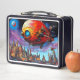({ AI Art }}+ Farbenfrohe Steampunk-Luftschiff schweben über mittelalterliche Stadt auf einem anderen Planeten.